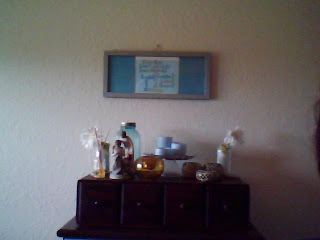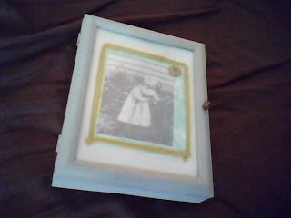 (Didn’t take a before photo, but believe me, it wasn’t cute) Before, this was a gold box with a horrible picture of a bloomed flower. It was a labor of love sprucing this up- it took many coats of paint, and lots of patience, yarn, a glue gun, an image and a button to make this complete.