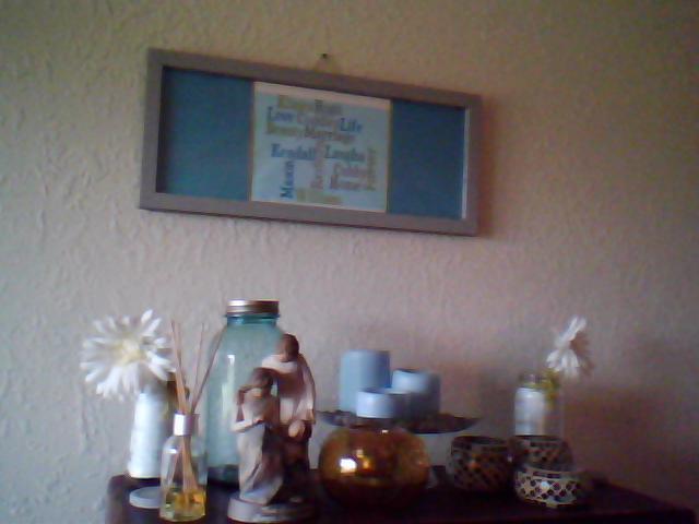 I went to https://www.wordle.net/ , entered in various words like:love, family, friendship, marriage and the site scrambled the words into this image. Then I took an old frame that was laying around slabbed some new paint on it, cut out scrapbook paper to line the image, and added in a border with green yarn and a glue gun!