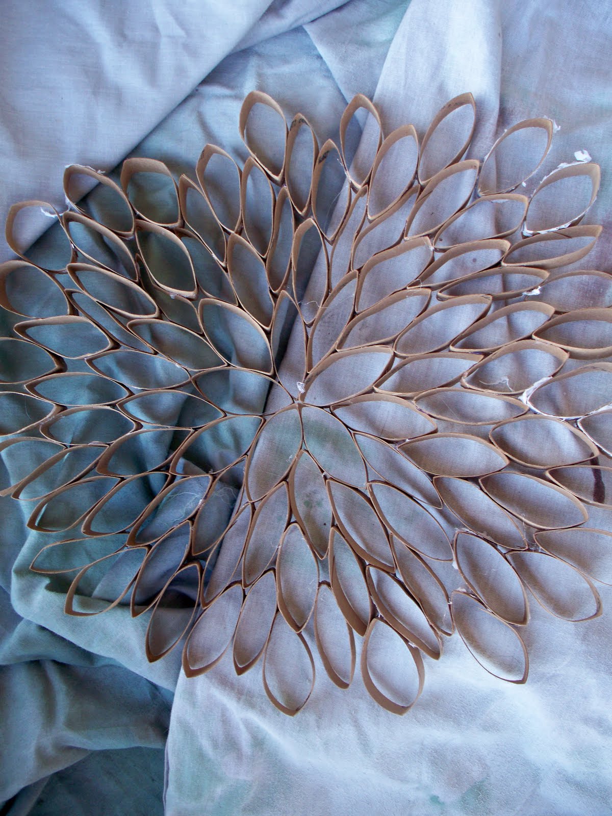 Then the next day I decided to make a sunburst from toilet paper rolls. I saw it somewhere (and can’t remember where now), and the idea has been in my head. SO, I got together some toilet paper rolls, cut them up, and began gluing.{I started with a small flower, and built off that}