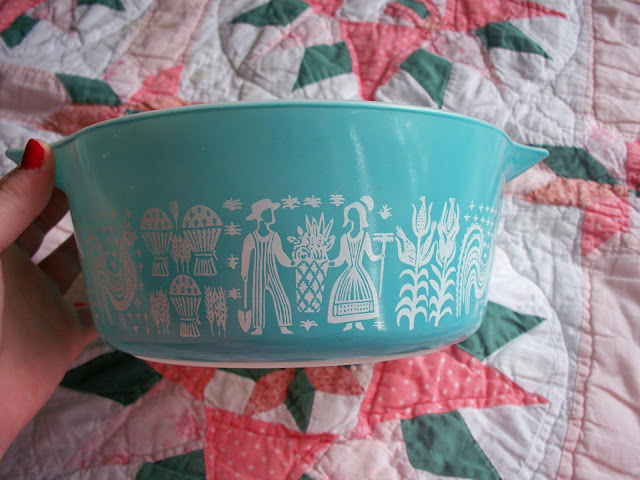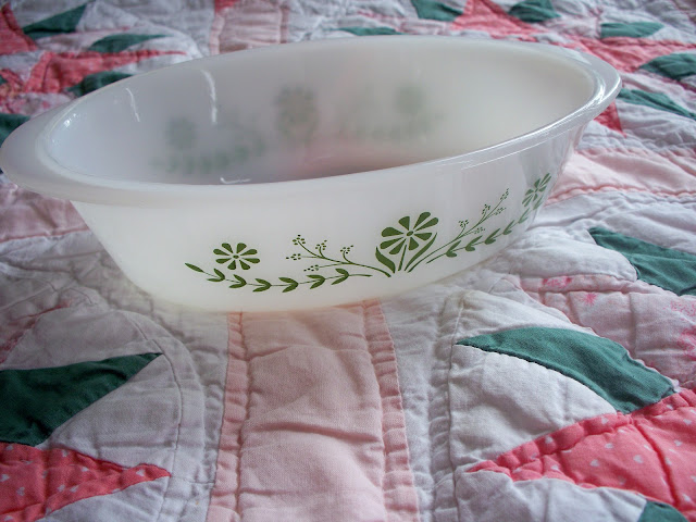 Ah I love vintage pyrex! Whenever I am at the thrift store and I spot some I always buy it. Its getting to be a little ridiculous! And I totally had those white plates with the green flowers growing up!!