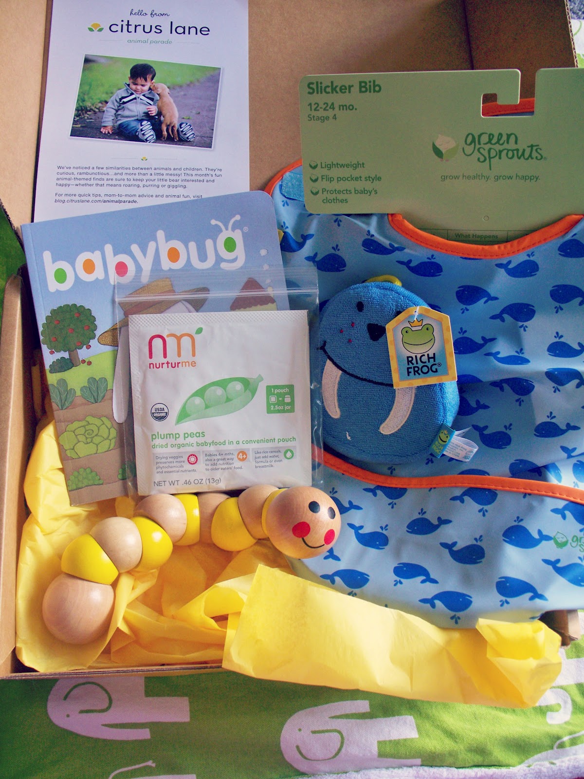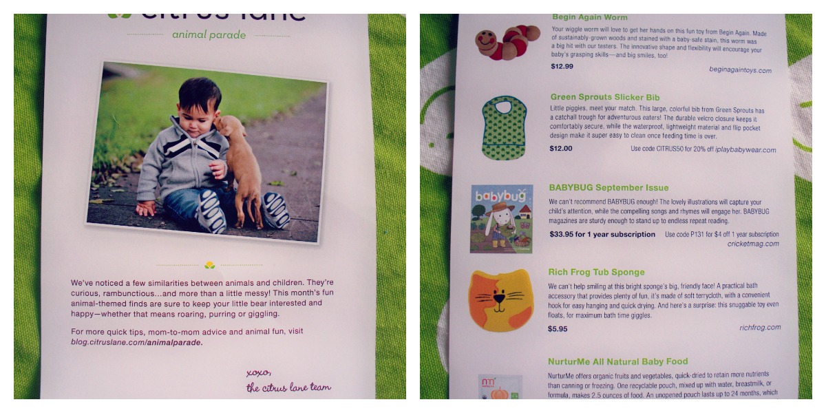 Citrus Lane is a company that specializes in sending the cutest baby goodies to your door each month for $25 (that includes shipping). It’s a subscription to awesomeness. Wyatt and I have been getting the boxes for months now and we absolutely love them! We look forward to opening our brightly colored box each month to see what kind of goodies are packed inside. There is a list included in each box with item descriptions (and retail costs) so you know exactly what kind of deal you are getting each month. All of the boxes we have gotten have had $40+ value! Plus, shipping is included – and the sticker on the box says that costs $9+!