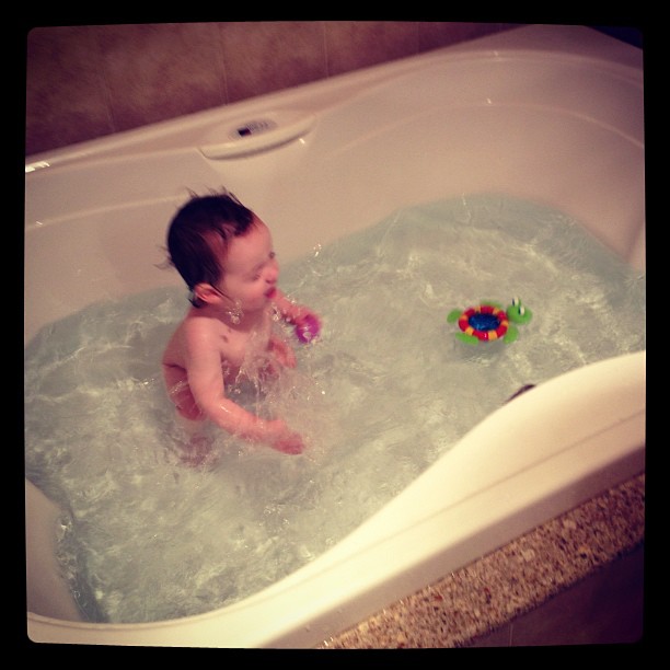 Okay, this thing is awesome. Wyatt is all into the little waterfall it makes when lifted out of the water – he thinks it is so cool! We loved using this in the HUGE tub on vacation (see photo below). He spent about an hour and a half playing in the tub!
