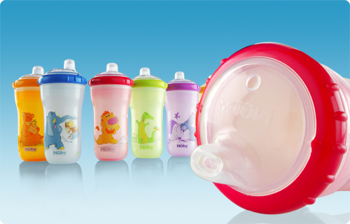 “The Nรปbyโข Insulated cups feature the No-Spillโข easy to use, easy to clean soft silicone spout that prevents spills and reduces leaks. The unique 1 piece valve promotes natural healthy drinking because it needs very little suction, allowing your childโs palate and teeth to grow naturally. The insulated base keeps drinks cooler for longer and prevents the cup from โsweatingโ reducing condensation and the risk of damage to furniture and work surfaces.” -Nuby