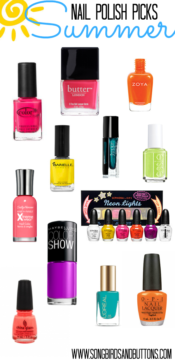 Hi all! I am so glad to be hanging out with all of you lovely Songbirds and Buttons readers! I have a serious nail polish obsession! If you stop my blog, Hairspray and Highheels, you will see that I am seriously always talking about it! Summer is my favorite season for nail polish because everything is super fun and bright. I’m happy to share with you all today some of my favorite Summer Nail Polish Picks!