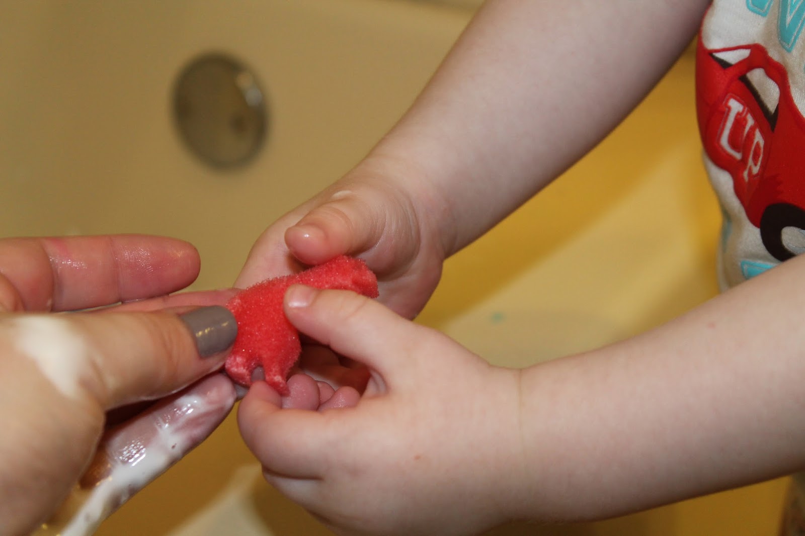 This is SUCH a fun activity that Wyatt and I loved doing together! It is very messy so make sure you have lots of towels on standby! Let your little one go crazy with the shaving cream and food coloring – it will turn the tub into a rainbow bath – and that makes playing with the dino’s that much more fun!
